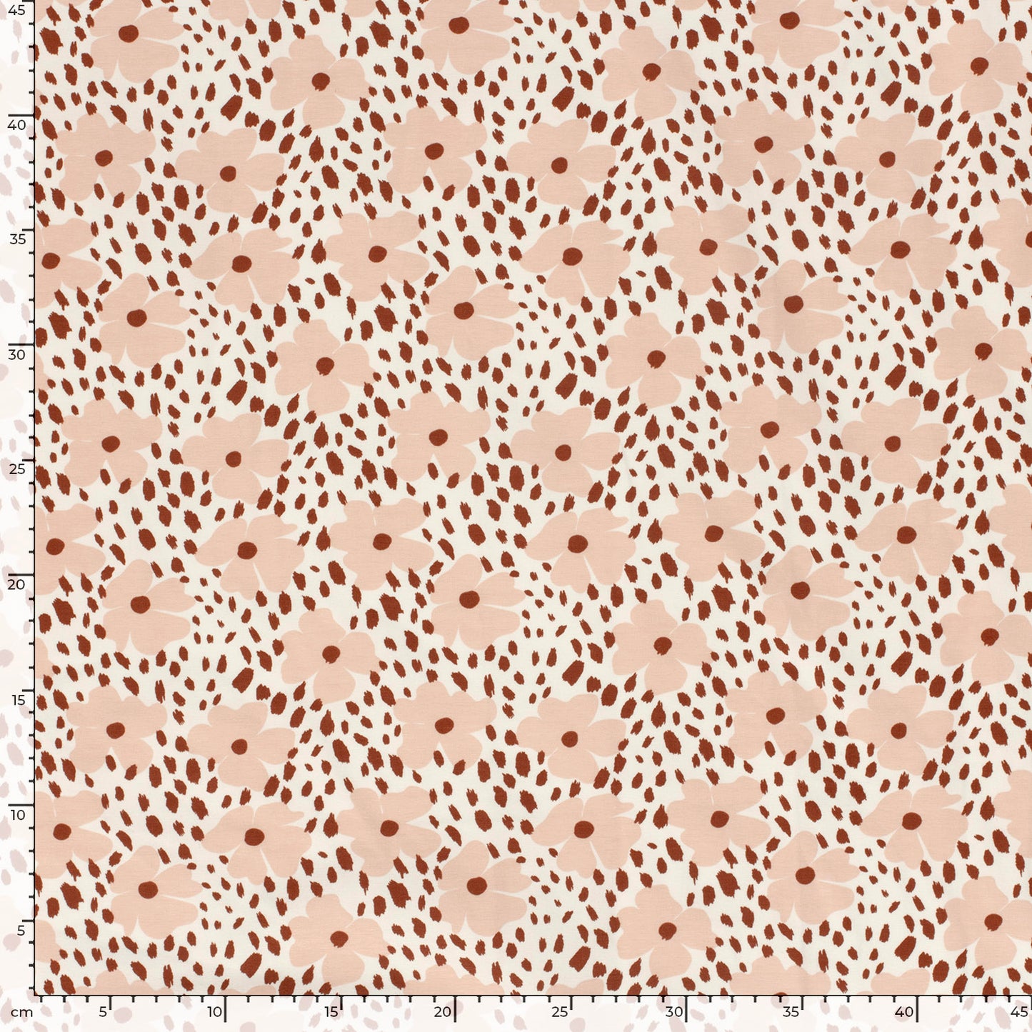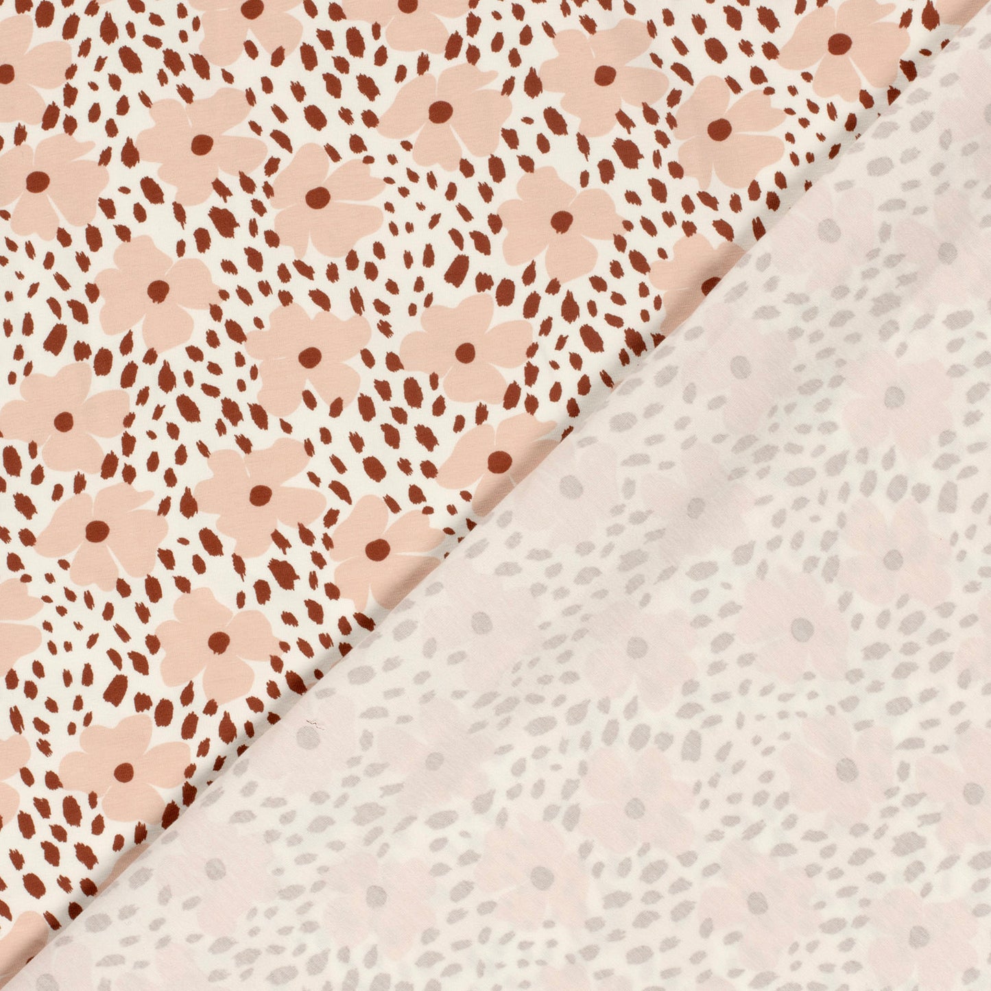 Jersey Stof Gebroken Wit Met Roze Bloem En Dierenprint