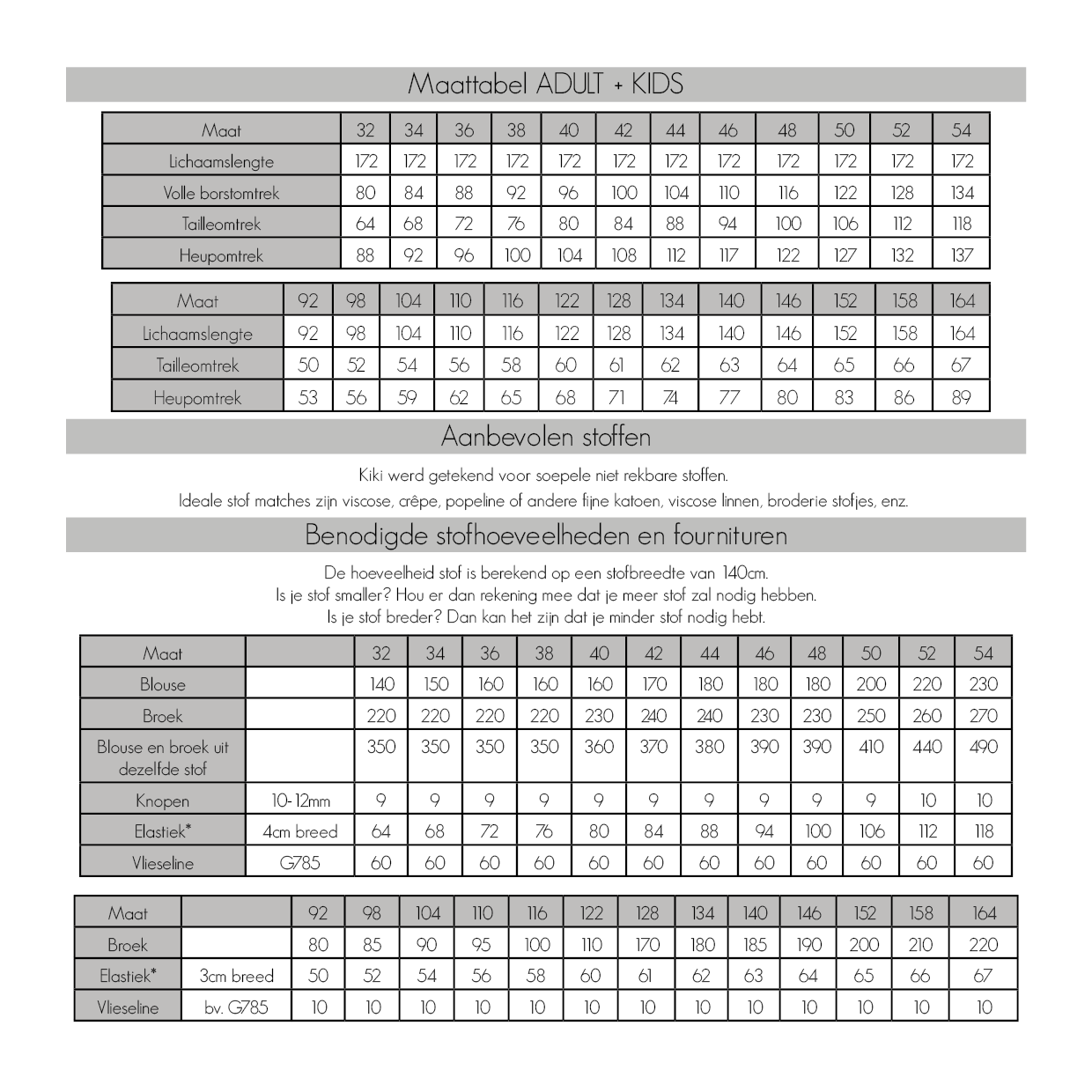 Ideale stof matches zijn viscose, crêpe, popeline of andere fijne katoen, viscose linnen, broderie stofjes, enz.