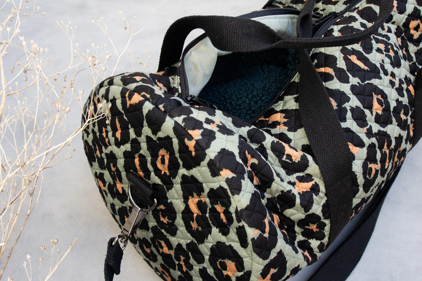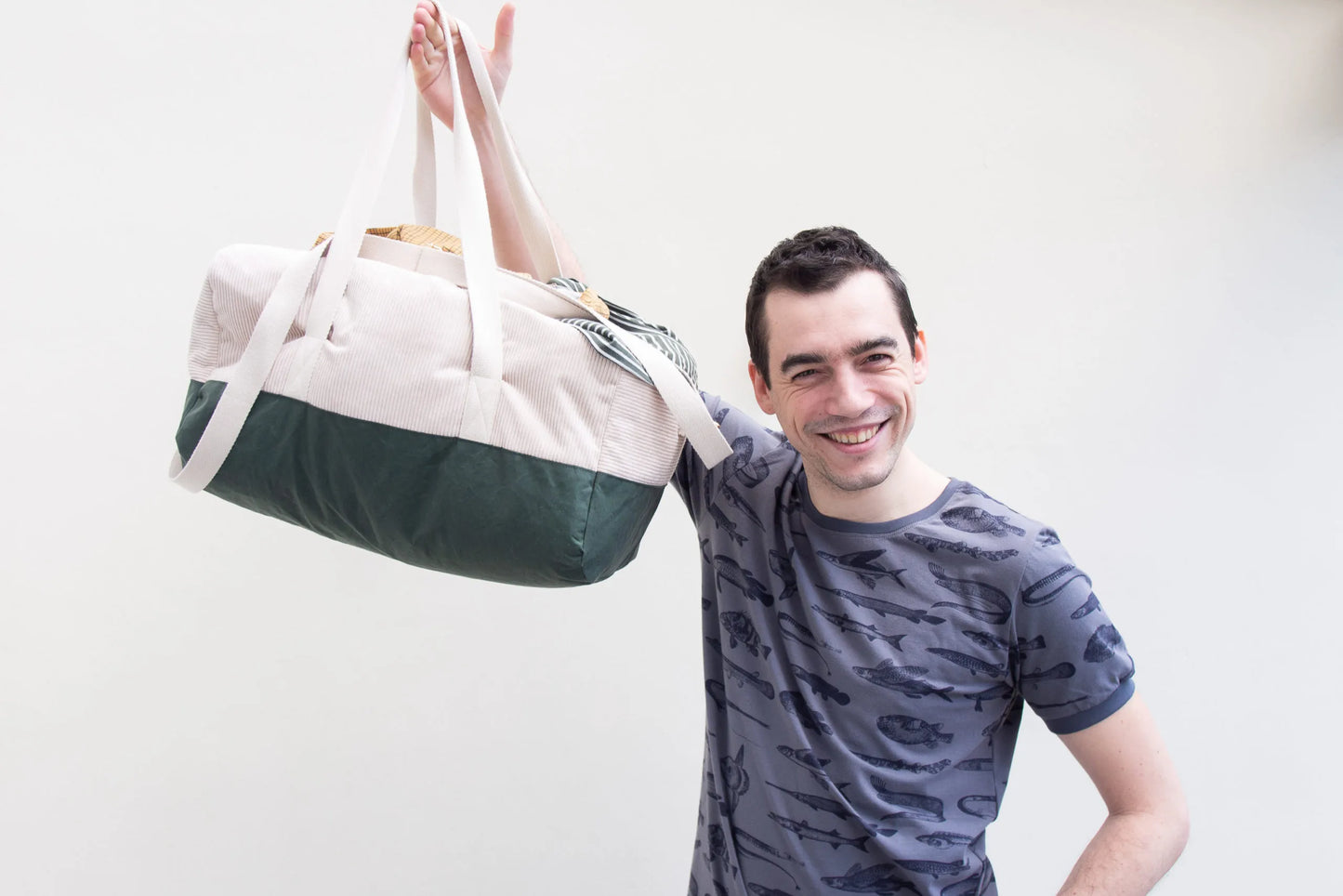 De sporttas heeft handvatten en een schouderriem en een binnenzakje dat sluit met drukknoopje of magneetje. Je kan hem uit één stuk maken of uit twee stukken met een bodem in een andere stof of kleur.